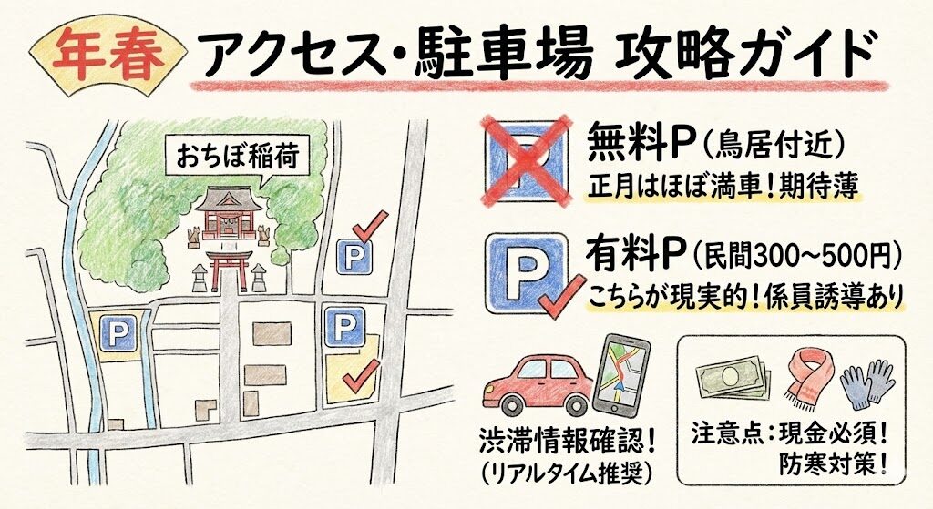 年末年始におちょぼ稲荷(千代保稲荷神社)を訪れる際、最も重要になるのがアクセス方法と駐車場対策です。正月三が日は参拝者数が一気に増え、神社周辺の道路や駐車場は普段とは比べものにならないほど混雑します。事前にアクセス情報を把握しておくことで、無駄な待ち時間やストレスを大幅に減らすことができます。